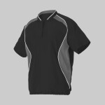 50% polyester/50% cotton jersey knit * Contrast color 1x1 rib knit V-neck collar * Two contrast color sleeve stripes * Set-in sleeves * Double-needle hemmed sleeves and bottom