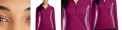 By mixing heather with a solid color and adding reflective hits, this moisture-wicking pullover has a technical look plus plenty of stretch for easy movement. 90/10 poly/spandex jersey Soft-brushed backing Tag-free label Reflective details on right sleeve and lower back Feminine curved and blocked design details on back Cadet collar Reverse coil zipper Princess seams Raglan sleeves Open cuffs and hem Thumbholes to keep hands warm Drop tail hem Due to the nature of 100% polyester performance fabrics, special care must be taken throughout the printing process.
