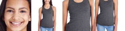 5.5 oz., 100% combed ringspun cotton premium jersey ; Granite Heather and Vintage Smoke are 60/40 combed ringspun cotton/polyester; White is sewn with 100% cotton thread for easy garment dyeing; 1/4" single needle binding on neck and armholes; Racerback silhouette; Side seam construction; Raw serge shirt tail hem bottom allows for easy freedom of movement; EasyTear™ label; CPSIA Compliant tracking label in side seam; Machine washable/ tumble dry low; Fit: Youth Girls';