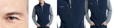 Ward off early morning chills by insulating your core with this soft, cozy vest. Contrast rolled top collar, zippered chest pocket, reverse coil contrast zippers, front zippered pockets with tricot lining, binding at armholes and an open hem. Contrast Eddie Bauer logo embroidered on right chest. Made of 12-ounce, 100% polyester fleece which incorporates Low Impact Technology for enhanced softness and performance.