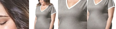 - Contrast topstitched self-fabric sleeve stripes