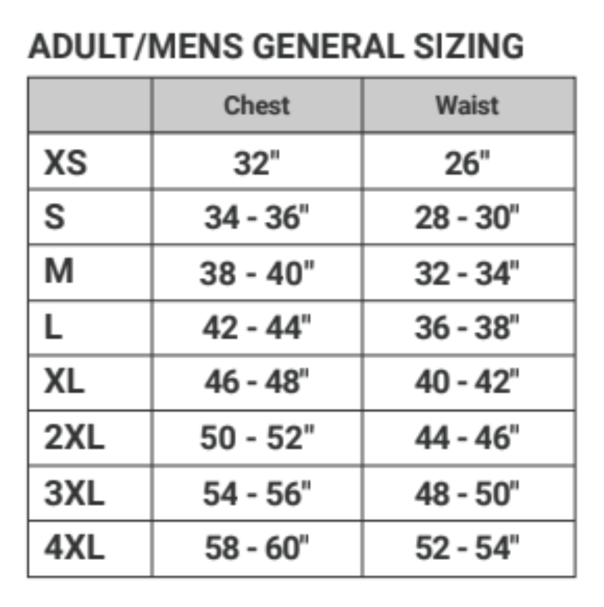 | Size | XS | S | M | L | XL | 2XL | 3XL | 4XL |