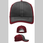 100% cotton twill fabric; Low-profile structured crown with buckram-fused front panels; Pre-curved PE visor; Charcoal colored fronts and white contrast colored stitching on all colors; ProSweatband with twill face.