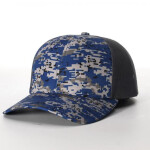 Cotton/polyester front panels and visor with nylon mesh back panels; Pro-Crown shape with buckram-fused front panels and ProStitching; Screen Printed Charcoal/White Plaid Pattern; Pre-curved PE visor with eight rows of stitching.