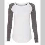50% polyester/50% combed cotton slub fabric * Ladies fit * Semi-fitted silhouette * Pad print label * Contrast color self-fabric collar * Raglan sleeves * Contrast color sleeve insert and sleeve stripe * Double-needle hemmed sleeves and bottom