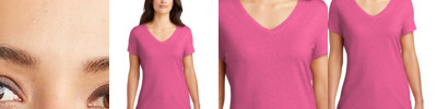 92% polyester/8% spandex wicking pinhole mesh * Wicks moisture away from the body * Ladies' fit * Heat sealed label * Self-fabric V-neck collar * Set-in sleeves with shoulder inserts * Double-needle hemmed sleeves and bottom